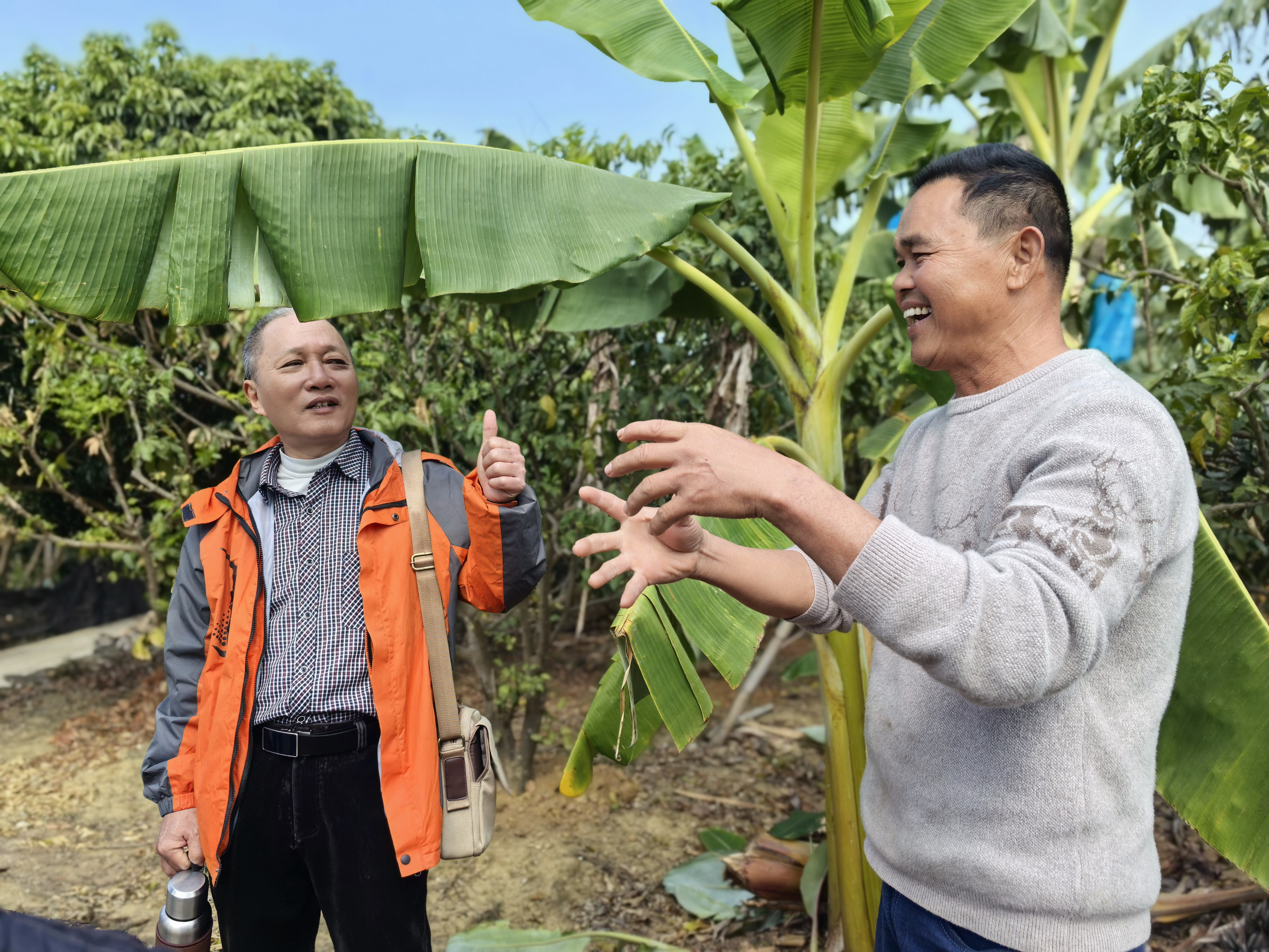 室内授课刚结束,两位专家便与农户一同走进新垌镇黄皮公园和粉蕉套种基地。翠绿的果园中,农户们围绕专家踊跃提问:“套种后水肥如何分配?”“蕉叶出现病斑该怎么处理?”专家们俯身查看植株长势,手把手演示修剪技巧,面对面解答种植难题,实现从“课堂”到“田间”的无缝对接。